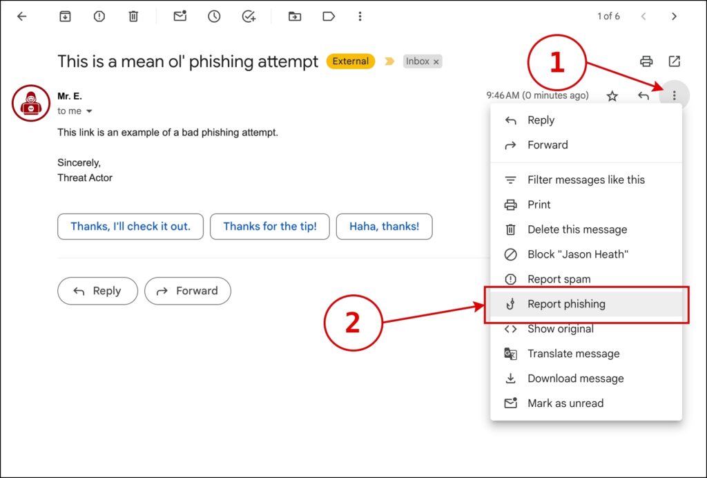 Please do not respond to the sender or contact the sender through the provided phone number or any other contact method described in the email message. You can feel free to delete the email, but you can also report the email as phishing within Gmail which helps Google’s systems to learn and identify these attempts better in the future. Please see the image below which shows how to report an email as phishing within the Gmail web interface.