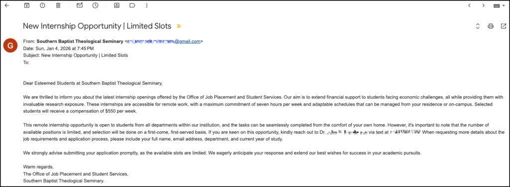 Like most phishing attempts, however, the email contains several red flags. One red flag in the email message is that it intends to create a sense of urgency by describing the scarcity of the offer. In the example above, the email states, “…the number of available positions is limited, and selection will be done on a first-come, first-served basis.” Phishing attempts utilize language like this to leverage human psychology and emotions (e.g. fear, anger, panic) so that the target is more likely to respond. The other red flag in the email message is that the message directs the recipient to make contact directly using an alternative form of communication. This can be a mobile number to text, a WhatsApp username, a direct message to a social media account, etc. When you see this tactic, but are unsure whether the offer is legitimate, you should always find the primary contact information for the supposed sender on their website and reach out to them via that contact information. In the example above, you would search for the Office of Job Placement and Student Services on https://www.sbts.edu (spoiler alert — it doesn’t exist). That search would show that the appropriate office at Southern is called the Office of Career Development, which is not even the same name from the email signature.